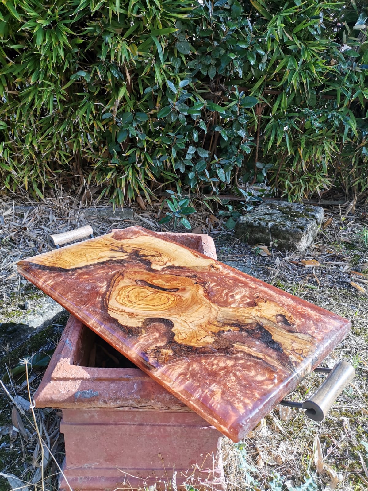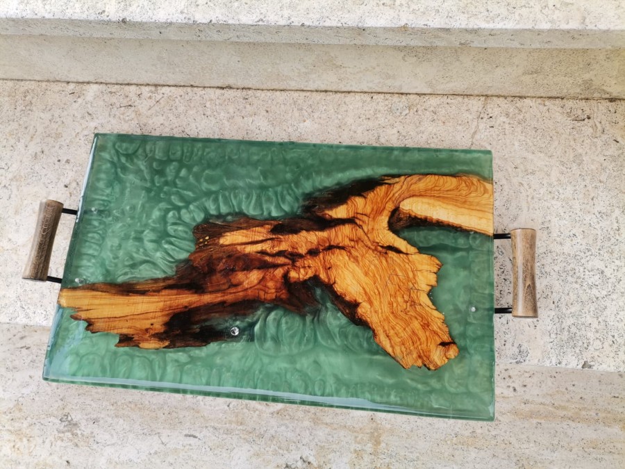 Vassoio da portata in radice ulivo e resina epossidica certificata per contatto alimentare.
