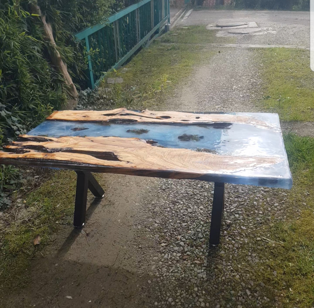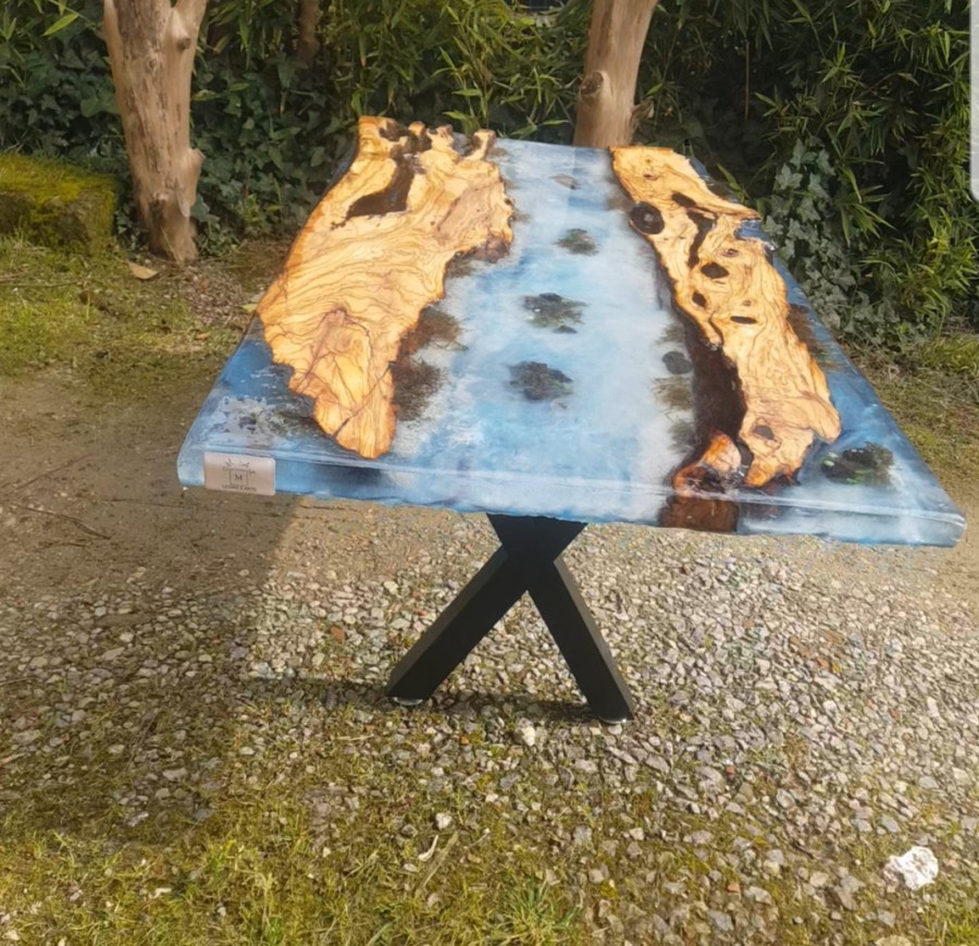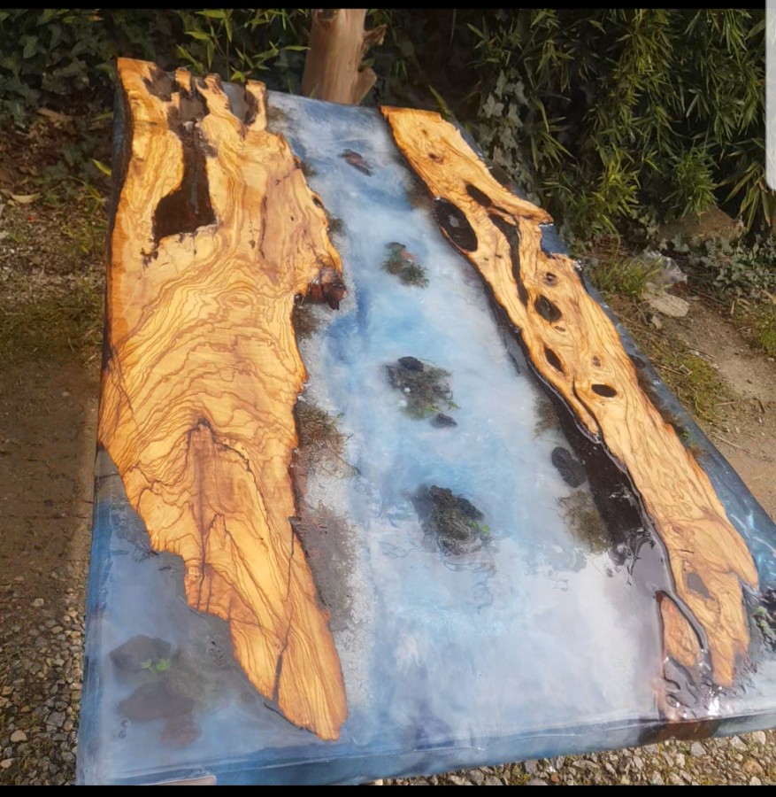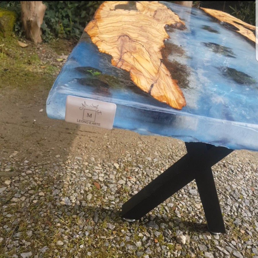 Tavolo da caffè in legno di ulivo e resina epossidica.Nebbia sul mare.