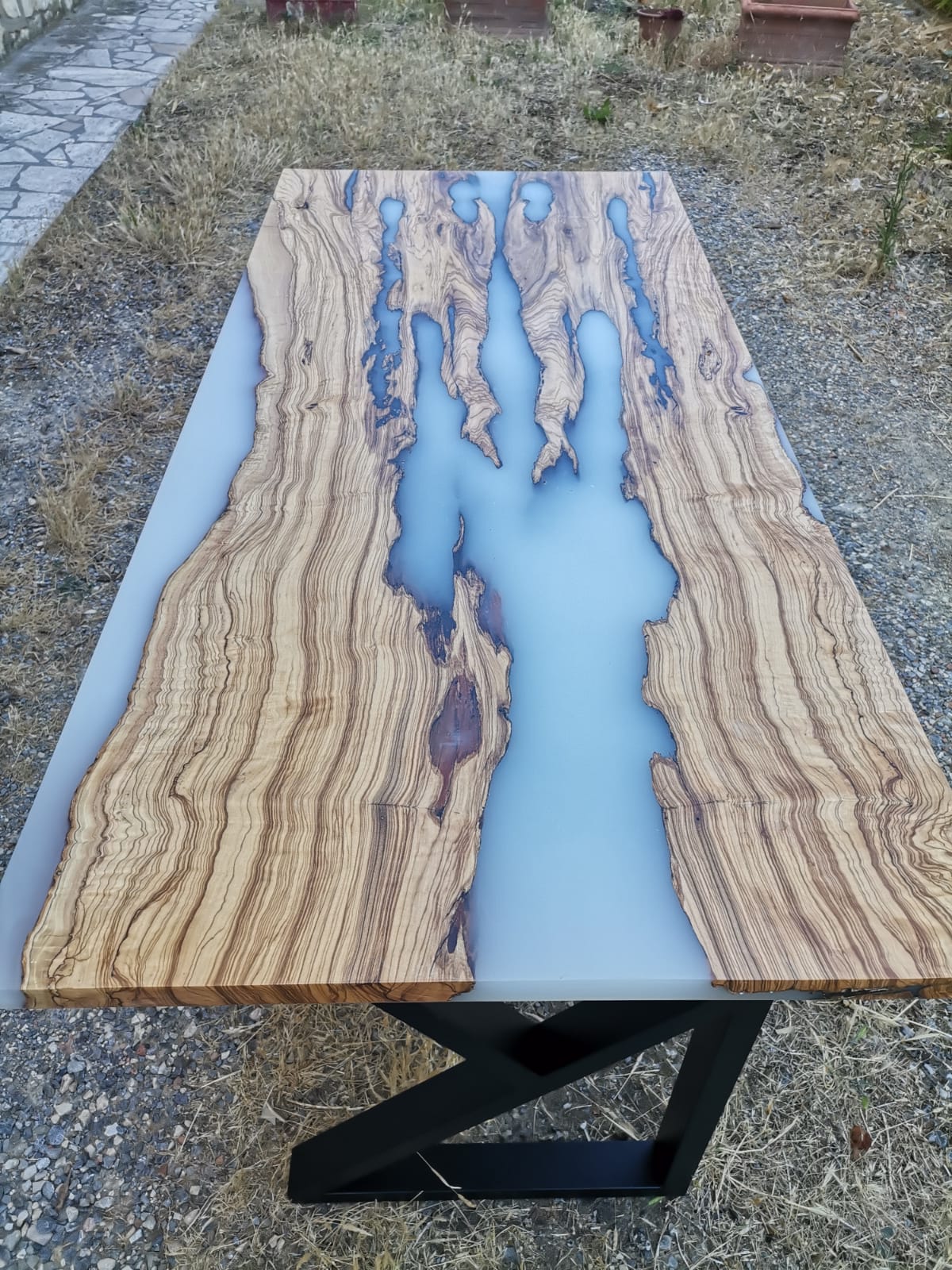 Scrivania in legno ulivo e resina epossidica grigio satinato con legno vivo a vista.